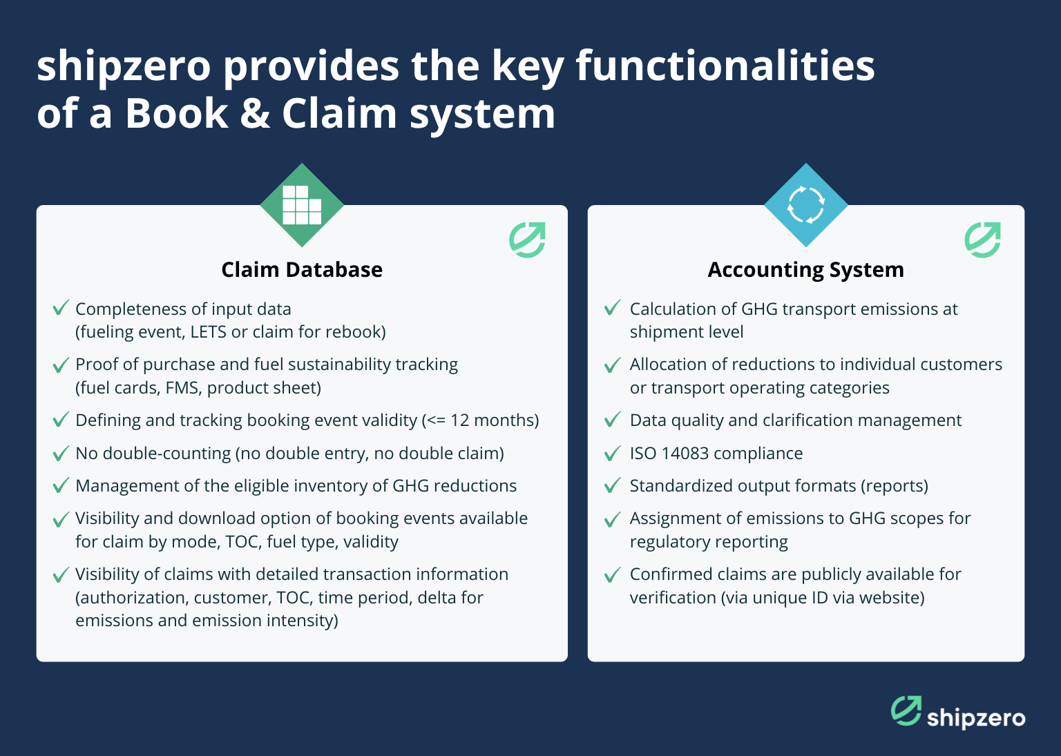 We do not participate in brokering transport services, nor do we sell or trade renewable fuels or transport assets, ensuring the independence of emissions records. shipzero validates its Book & Claim methodology annually with a reliable third-party verifier and makes all reasonable efforts to align claim statements with the Smart Freight Centre Market-based Measures framework for direct sustainable interventions.